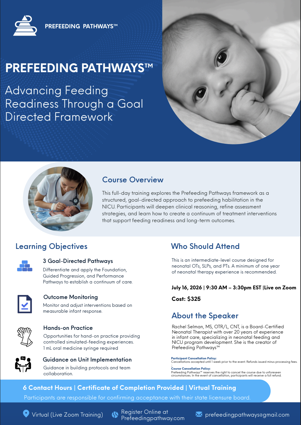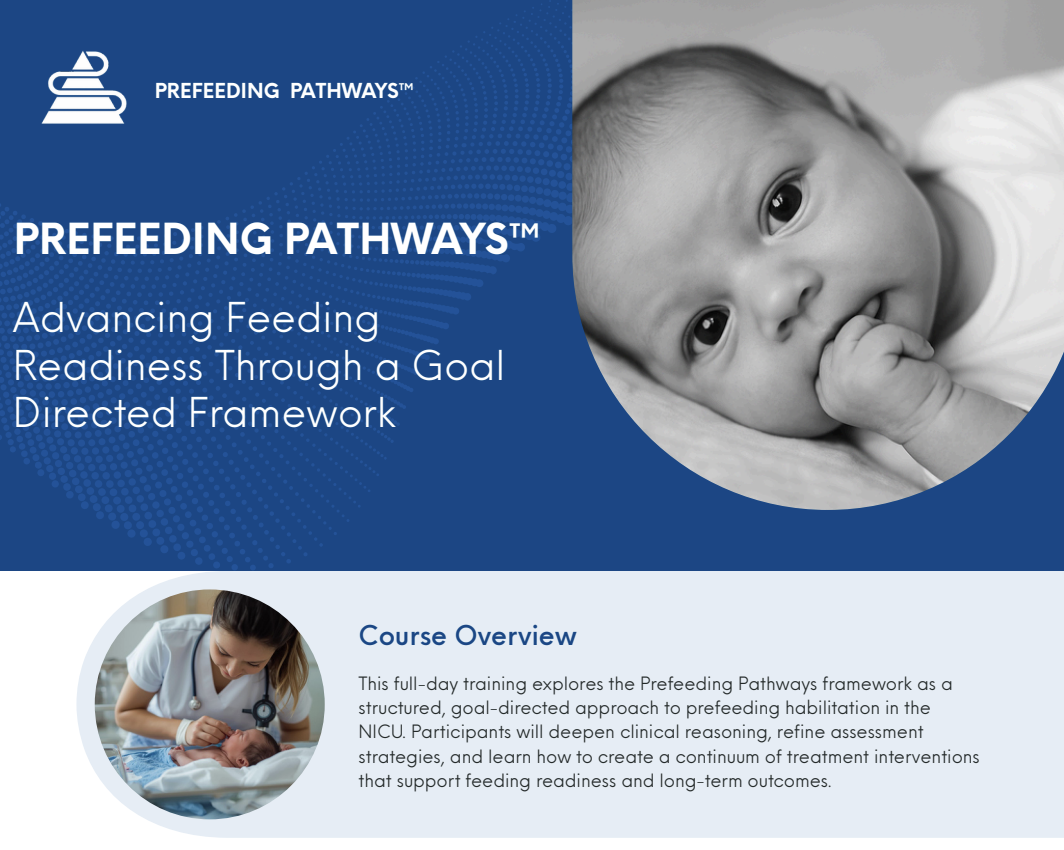 This full-day training explores the Prefeeding Pathways™ framework as a structured, goal-directed approach to prefeeding habilitation in the NICU. Participants will deepen their clinical reasoning, refine readiness assessment strategies, and develop a continuum of treatment planning that supports feeding readiness and long-term outcomes.